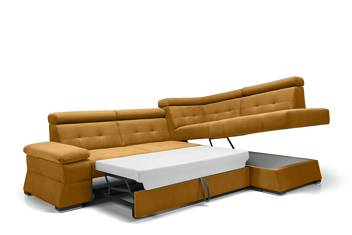 Niezwykły projekt narożnika z kolekcji Graf to kombinacja nowoczesnej aranżacji i niebanalnego wyglądu. Wyjątkowe, welurowe obicie dodaje całości elegancji, będąc jednocześnie przyjemnym w dotyku materiałem. Dzięki temu użytkowanie staje się jeszcze przyjemniejsze, nie tylko w codziennym wypoczynku, ale również podczas snu. Mebel bowiem z łatwością przyjmuje formę łóżka dzięki systemowi rozkładania typu delfin.