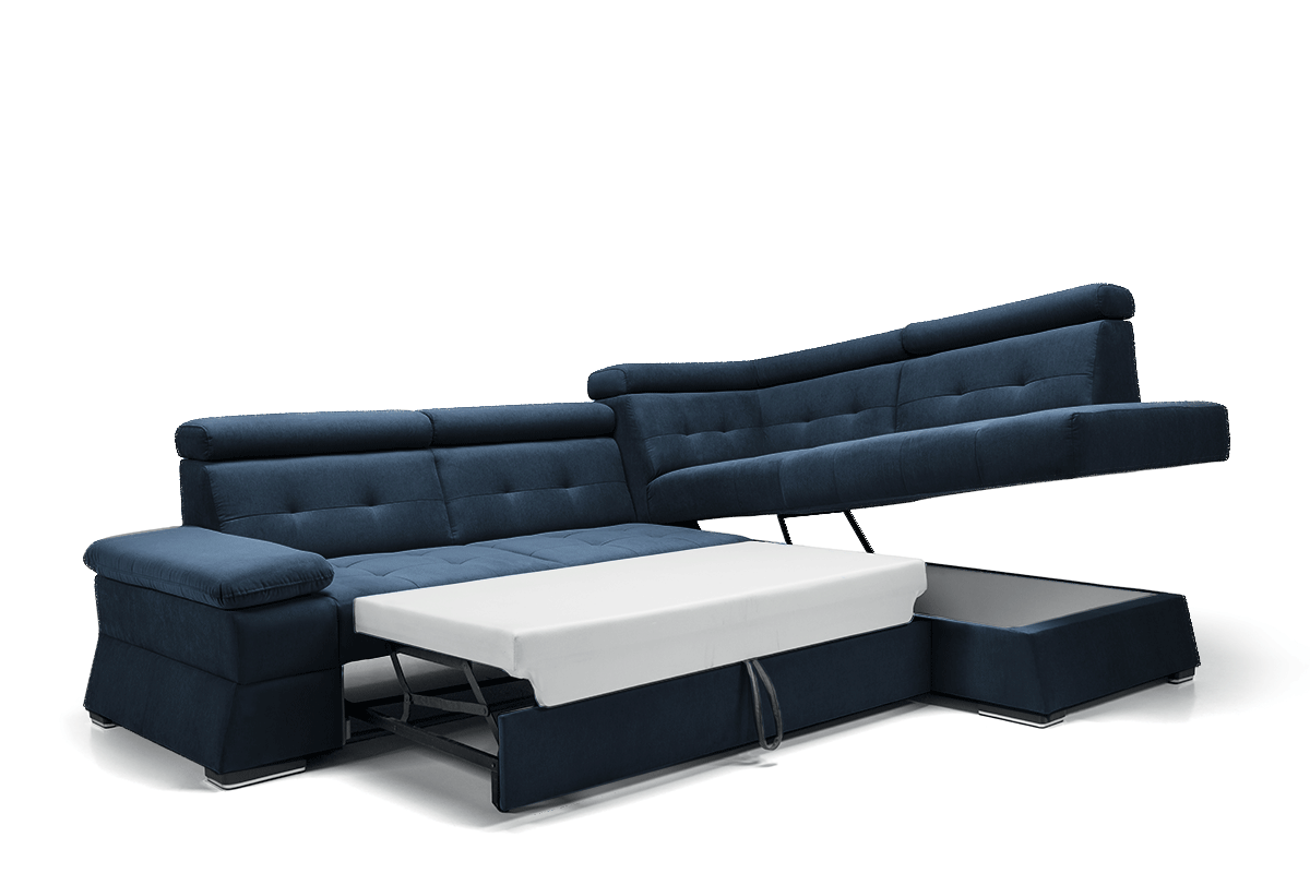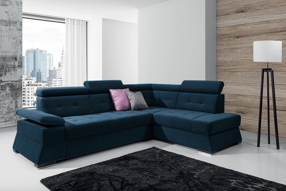 Narożnik posiada również pojemnik na pościel, co stanowi praktyczne rozwiązanie przy podejmowaniu gości. Konstrukcja opiera się wyłącznie na drewnie, stanowiąc solidny i naturalny stelaż. Podporą są nóżki z tworzywa sztucznego, dyskretnie umieszczone pod meblem. Narożnik posiada opcję prawo i lewostronną, a także warianty kolorystyczne: grafitowy, granatowy, morski oraz żółty.