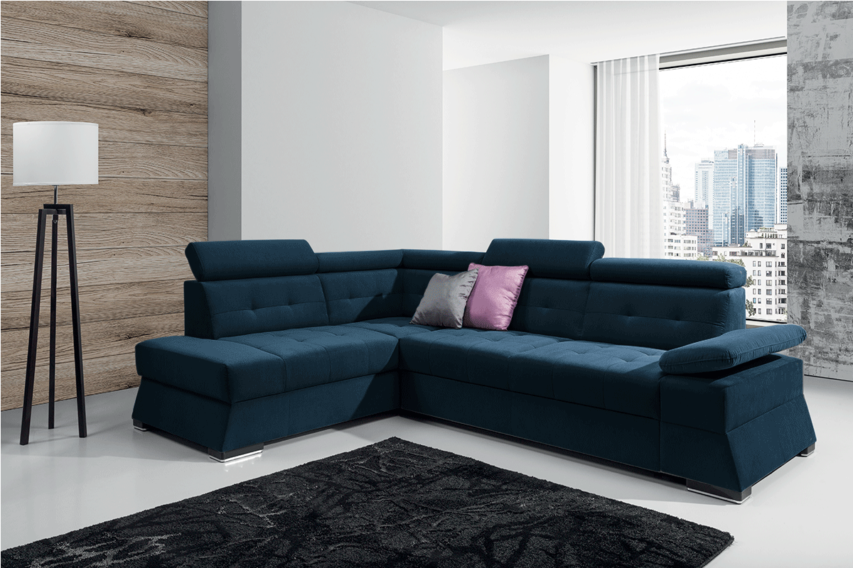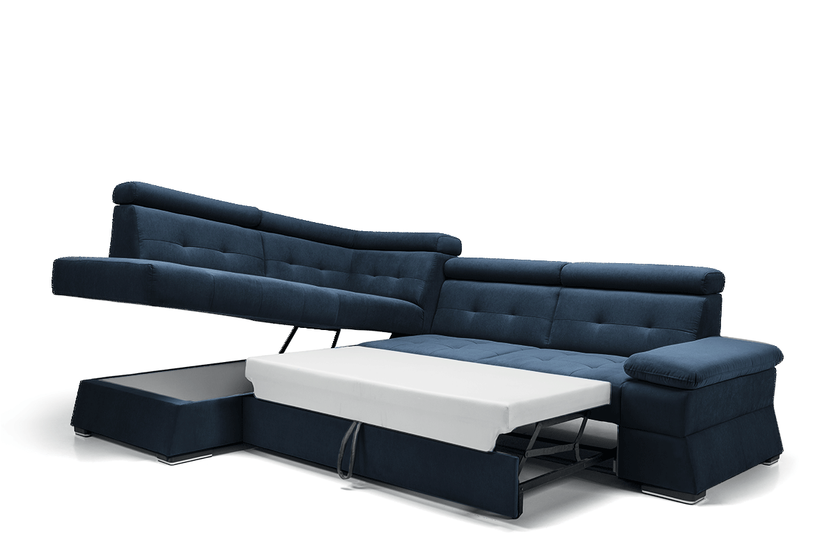Niezwykły projekt narożnika z kolekcji Graf to kombinacja nowoczesnej aranżacji i niebanalnego wyglądu. Wyjątkowe, welurowe obicie dodaje całości elegancji, będąc jednocześnie przyjemnym w dotyku materiałem. Dzięki temu użytkowanie staje się jeszcze przyjemniejsze, nie tylko w codziennym wypoczynku, ale również podczas snu. Mebel bowiem z łatwością przyjmuje formę łóżka dzięki systemowi rozkładania typu delfin.