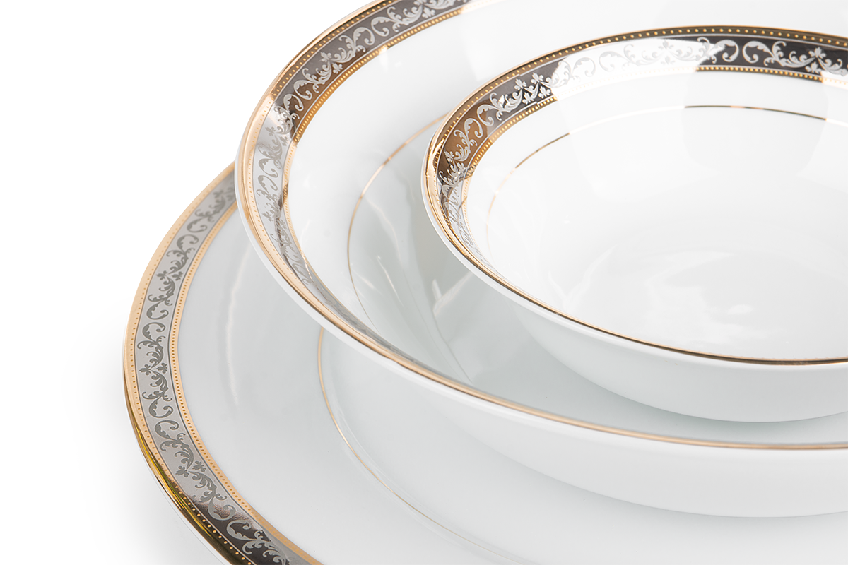 Porcelanowa kolekcja naczyń Conte wykonana została w pięknej bieli, a lustrzane zdobienia w ciepłych i eleganckich kolorach nadają jej dworskiego charakteru. Tradycyjne kształty są zaletą i sprawią, że z przyjemnością będziesz używał tych naczyń zarówno podczas eleganckiej kolacji, jak i podczas mniej formalnego spotkania. Kolekcję wykonano z najwyższej klasy porcelany, dzięki czemu przez długie lata będzie przyozdabiać stół czy wypełniać urokiem przeszklone witrynki.