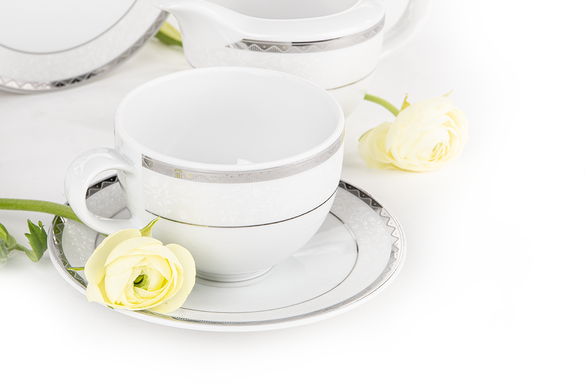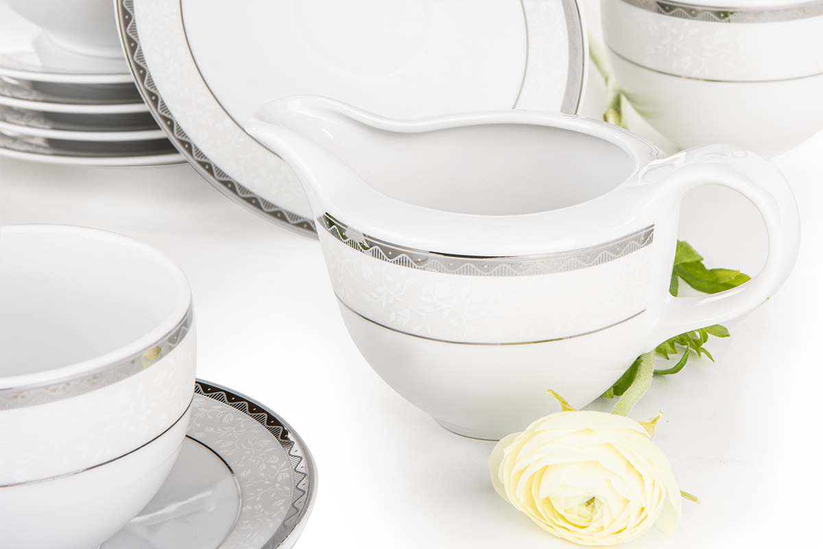 Wyrazista kolekcja naczyń AMELIA PLATYNA nada wnętrzom charakteru – doskonale będzie przyozdabiać stół czy wypełniać urokiem przeszklone witrynki. Zdobienie wyróżnia się znacząco kontrastującą z bielą falistą linią z oryginalnym wypełnieniem, a dodatkowego wdzięku nadają kolekcji naturalne, wypukłe motywy na śnieżnobiałej powierzchni. Kolekcję wykonano w całości w polskich fabrykach z najwyższej jakości porcelany, dzięki czemu przez długie lata będziesz mógł podawać gościom dania w pięknej porcelanie.
