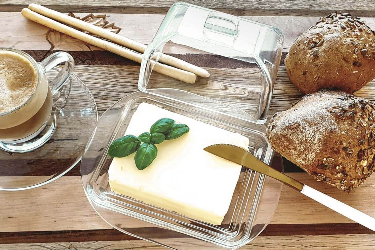 Szklana maselnica IDA to eleganckie naczynie o klasycznym kształcie z pokrywą przyjaźnie otulającą kostkę masła. Podziel się jej zawartością ze swoimi bliskimi przy wspólnym śniadaniu.