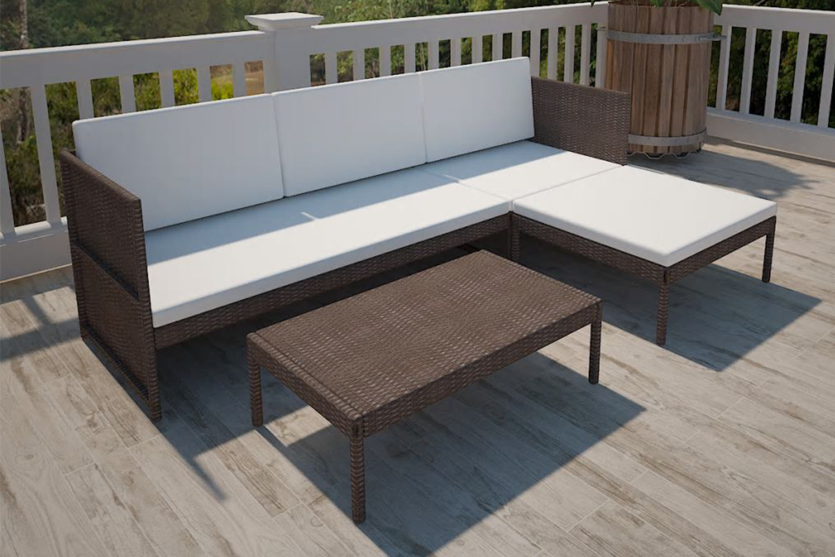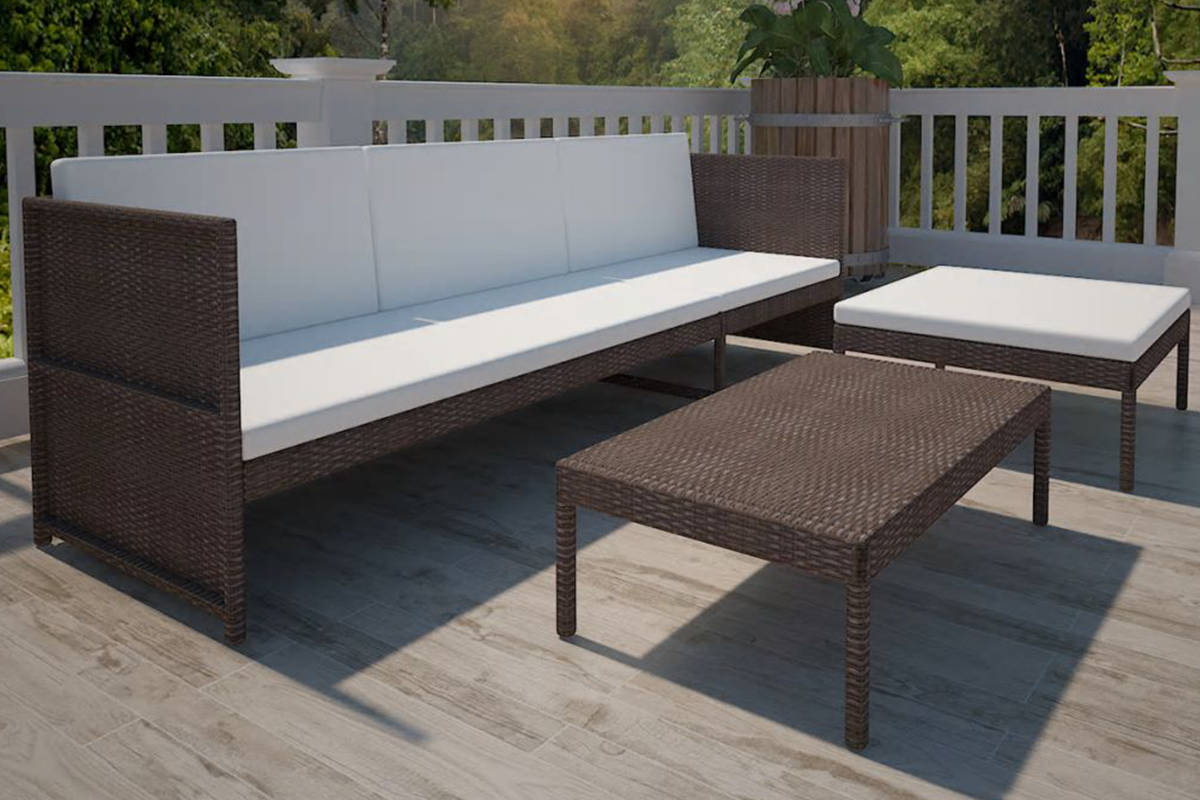 Siedziska posiadają mocną, krytą proszkowo, stalową ramę, która nadaje im trwałość. Meble są również lekkie, co pozwala na swobodne ich przestawianie. Grube, zdejmowane poduszki są wypełnione włóknami bawełnianymi, które zapewniają najwyższy komfort siedzenia. Poszewki poduszek wykonane są z poliestru i mają zamek błyskawiczny, dzięki czemu można je z łatwością zdjąć i wyprać. Rattanowe meble są bardzo ustawne i mogą być przestawiane dowolnie, aby dopasować je do otoczenia. Przesyłka obejmuje: 1 sofę trzyosobową, 1 stołek, 1 stolik kawowy, 3 poduszki na siedziska i 3 poduszki na oparcia. Uwaga: zalecamy przykrycie zestawu na czas deszczu, śniegu i mrozu.