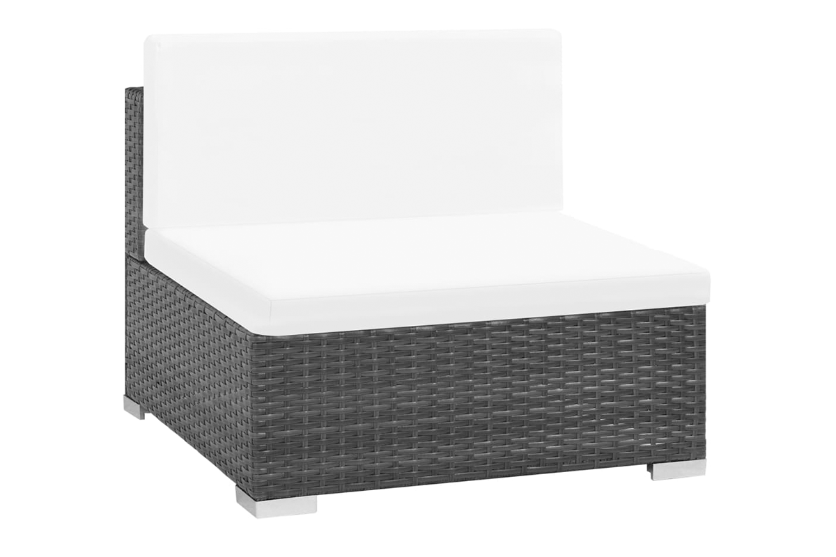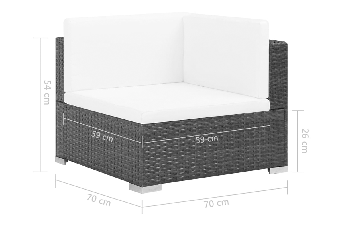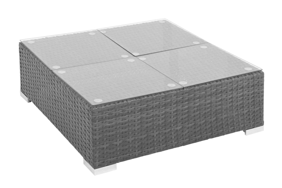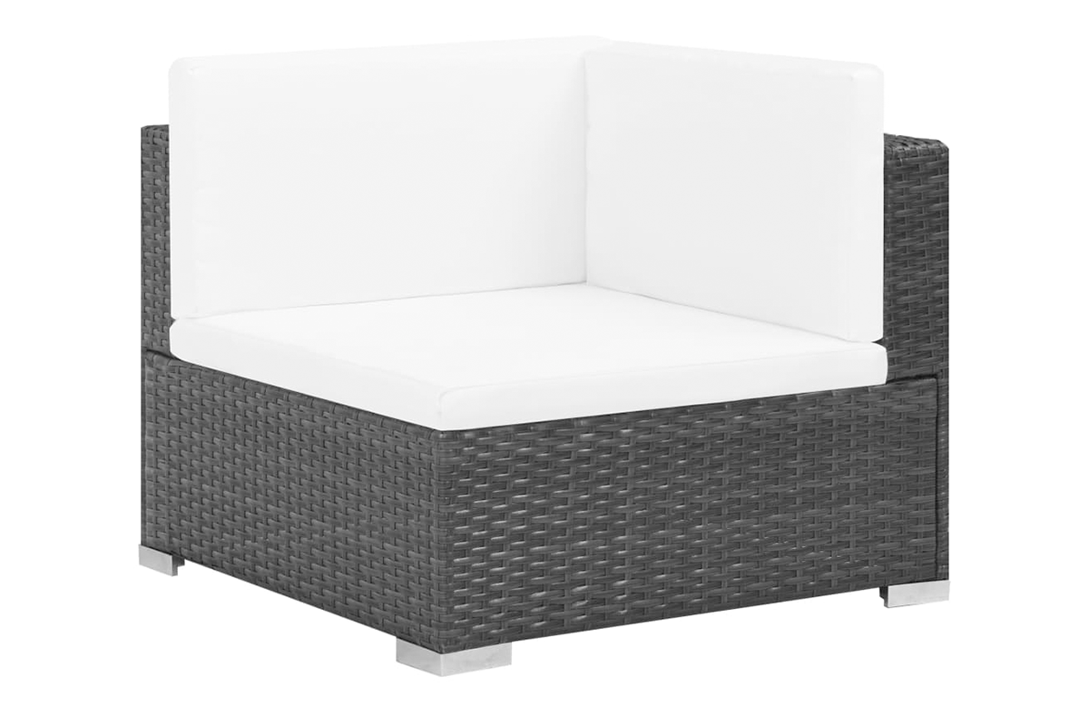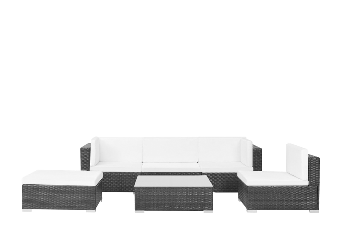 Polirattanowy zestaw wypoczynkowy, składający się z 2 sof narożnych, 2 sof środkowych, 1 stolika kawowego, 1 pufa, 6 poduszek na oparcia i 5 poduszek na siedziska, stworzy stylowe miejsce do siedzenia na tarasie lub w ogrodzie. Dzięki odpornemu na czynniki pogodowe rattanowi PE zestaw wypoczynkowy jest łatwy w czyszczeniu, wytrzymały i odpowiedni do codziennego użytkowania na zewnątrz.