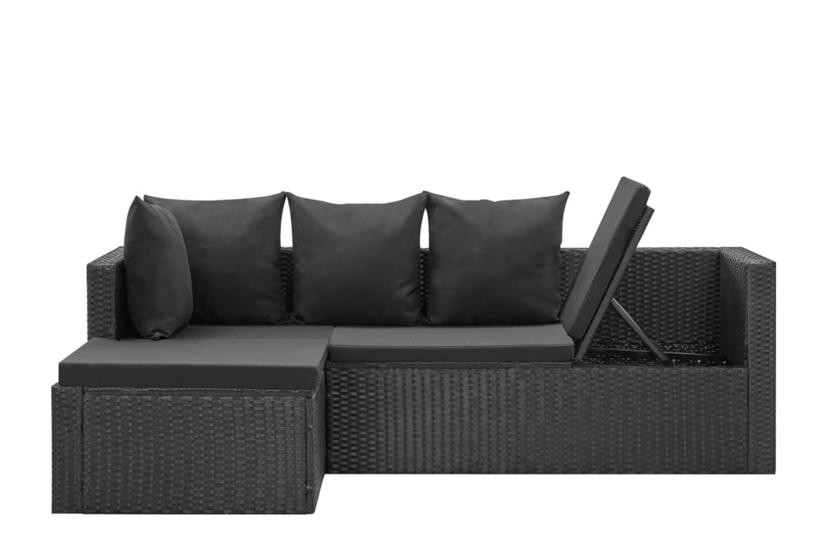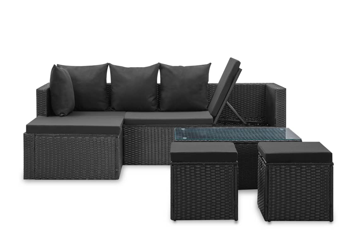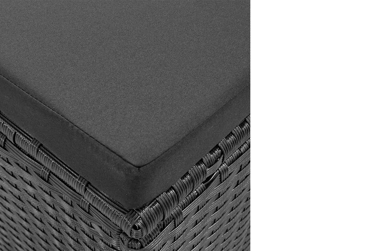 Dzięki lekkiej konstrukcji meble można łatwo przestawiać. Przesyłka zawiera bardzo wygodne, grubo wyściełane poduszki na siedziska i pod plecy. Poszewki poduszek można zdjąć i wyprać. Dodatkowo, jedną stronę sofy można podnieść i dostosować jej wysokość tak, by uzyskać najwygodniejszą pozycję (do wyboru 3 poziomy). Przesyłka zawiera sofę narożną, stolik kawowy, 2 pufy, 4 poduszki na oparcia i 6 poduszek na siedziska. Uwaga: zalecamy przykrycie zestawu na czas deszczu, śniegu i mrozu.