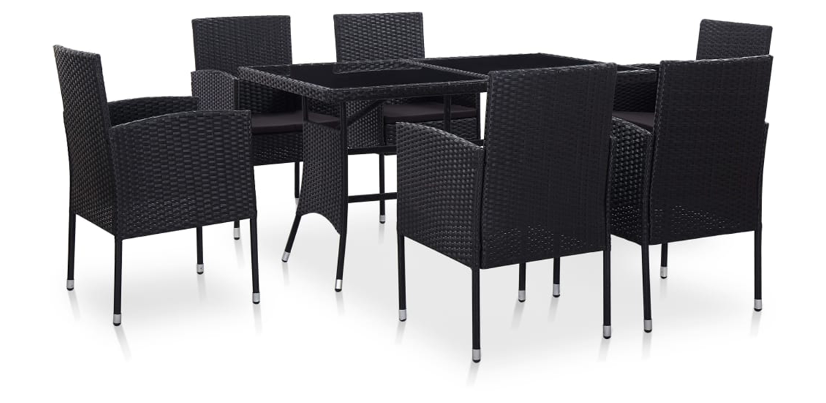 Grube, zdejmowane poduszki na siedziska są wyjątkowo wygodne. Przesyłka zawiera: 1 stół z blatem ze szkła, 6 krzeseł i 6 zdejmowanych poduszek. Uwaga: zalecamy zabezpieczenie zestawu podczas deszczu, śniegu i mrozu.