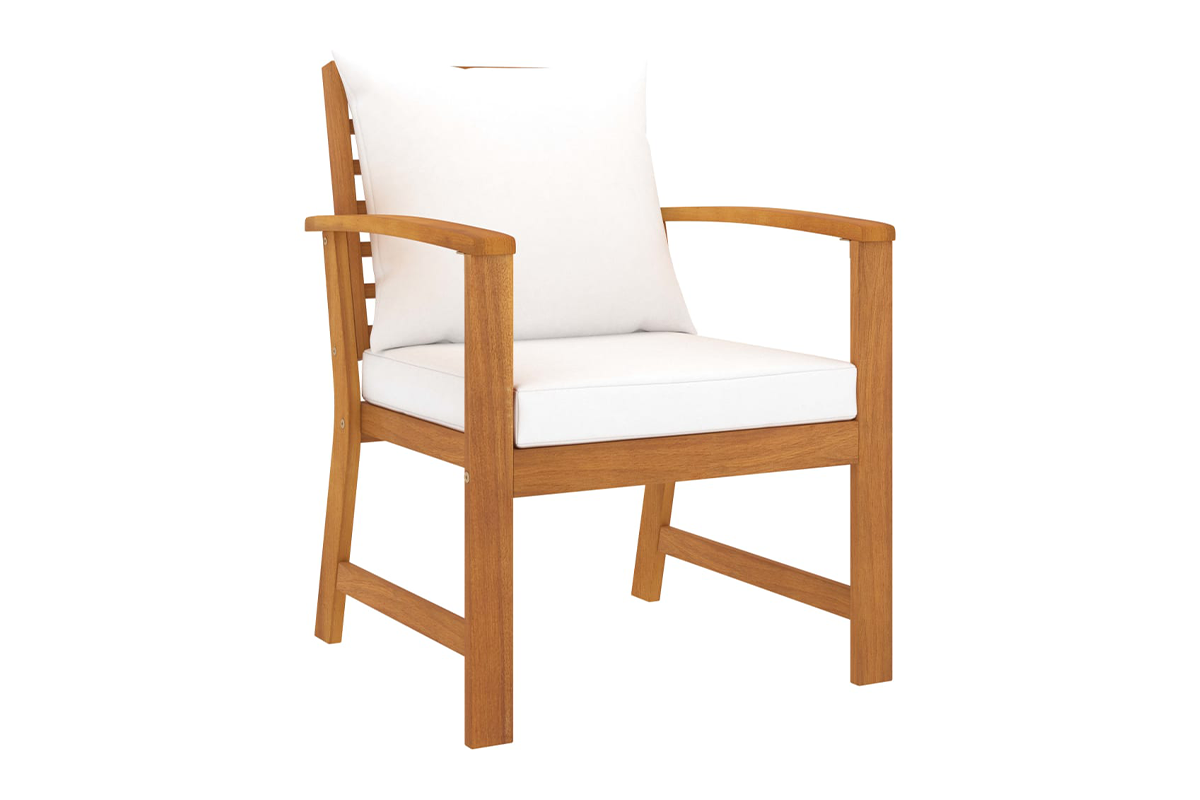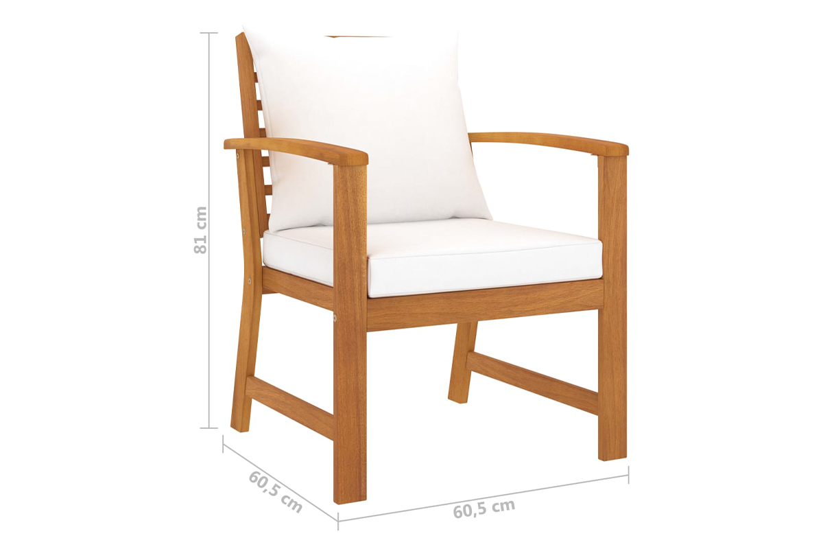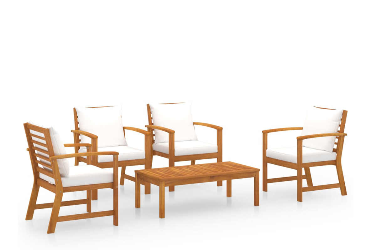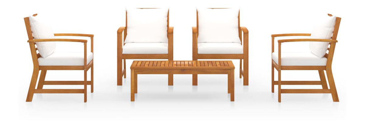 Ten zestaw drewnianych mebli wypoczynkowych doskonale łączy styl i funkcjonalność. Dzięki niemu możesz zrelaksować się ze swoimi znajomymi lub rodziną w ogrodzie. Posiadający ramy z litego drewna akacjowego zestaw mebli jest mocny, trwały i wytrzymały, a dzięki wykończeniu olejem odpowiedni do użytkowania na zewnątrz. Zdejmowane poduszki na siedziska i oparcia są grubo wypełnione i zapewniają komfort siedzenia.