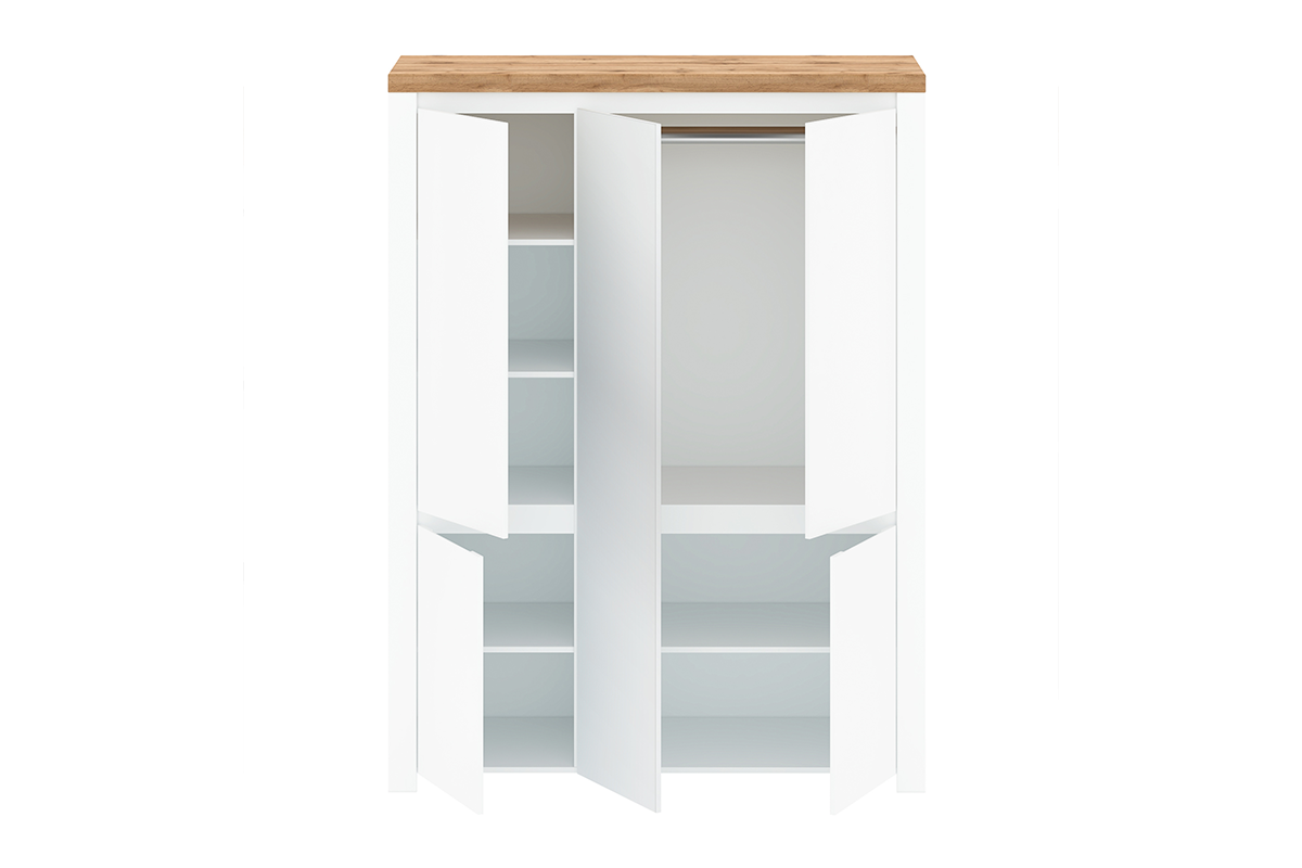 Szafa została utrzymana, podobnie jak cała kolekcja Damino, w klasycznym, prostym designie. Biały, delikatnie połyskujący korpus mebla, został dopełniony elementem w kolorze dębu wotan na szczycie produktu.