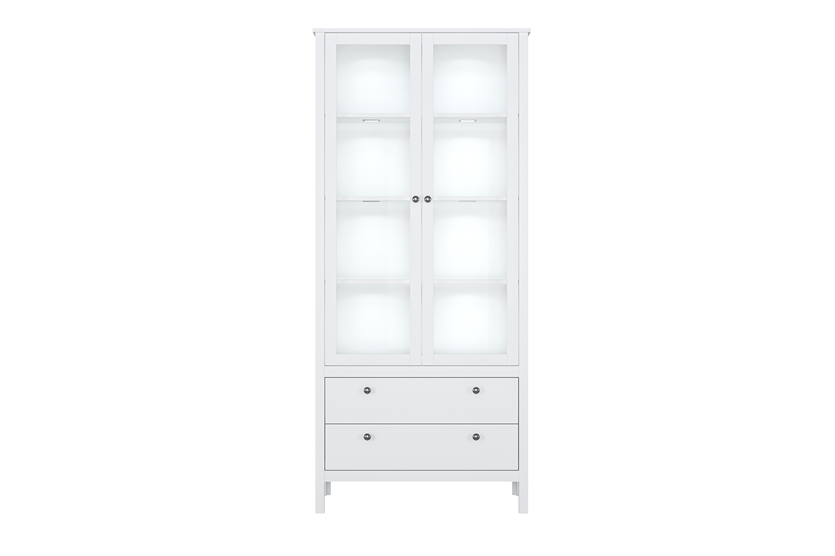 Witryna Farge może funkcjonować jako witryna na szkło czy mała biblioteczka. Dzięki swoim średnim wymiarom 90x201x37 cm dopasuje się do większości pomieszczeń. Wewnątrz mebla znalazły się 3 półki zamykane przeszklonymi drzwiczkami z możliwością zamontowania światła LED oraz szafka z dwiema szufladami zamontowanymi na prowadnicach kulkowych. Opcjonalne oświetlenie LED 12020.23.147 i 12020.19.147