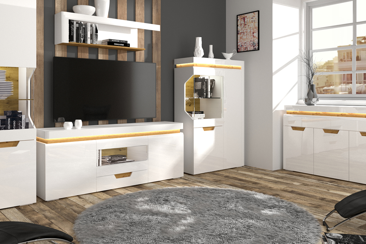 TECTO zobacz całą kolekcję Szafka RTV w stylu skandynawskim - kolor biały połysk/dąb nawarra