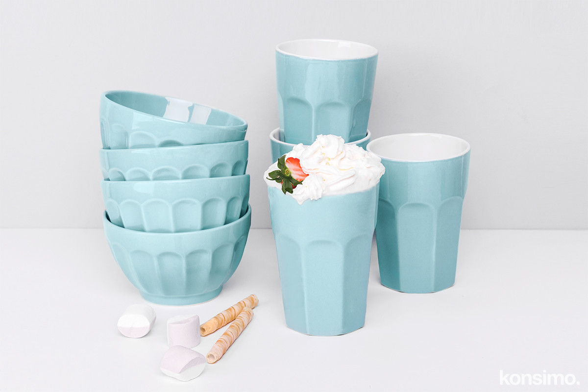 W zestawie znajduje się wyjątkowy kubek, który pomieści 480 ml napoju oraz piękna miska o pojemności 500 ml . Zestaw jest do dostępny w jednym z pięciu niepowtarzalnych kolorów.