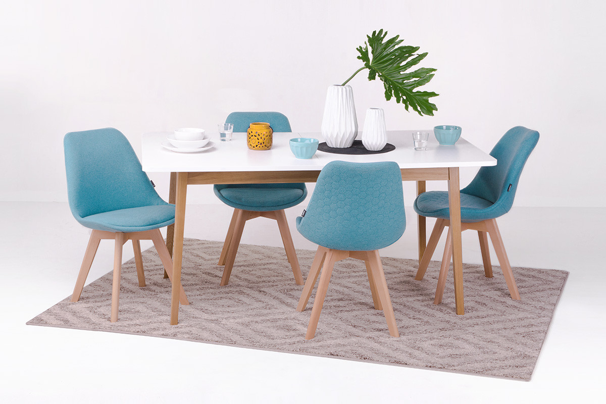 NETAL, FRISK zobacz całą kolekcję Biały stół rozkładany skandynawski z krzesłami - kolor turkusowy| biały/dąb naturalny