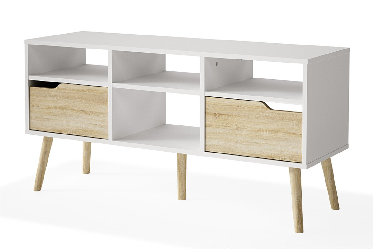 Szafka RTV z kolekcji FUNDO to mebel o prostej budowie, lecz ciekawy i niebanalny. Charakteryzuje ją minimalistyczny design, elegancki wygląd oraz funkcjonalność. Wykonana jest z białej płyty laminowanej. Fronty szuflad oraz charakterystyczne, skośne nogi są w kolorze dąb sonoma, ładnie kontrastującym z bielą. Wstawki w kolorze naturalnego drewna wprowadzają do wnętrza przytulny klimat oraz dodają charakteru białym meblom.