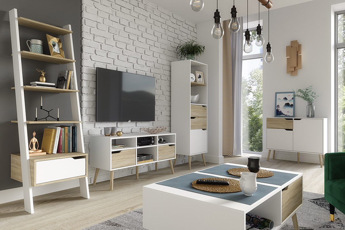Front szuflady oraz modne, skośne nogi są w kolorze dąb sonoma. Takie wstawki w barwie drewna ciekawie kontrastują z bielą, są elementem ozdobnym, który ociepla całe wnętrze, wprowadzając do niego przytulny klimat.