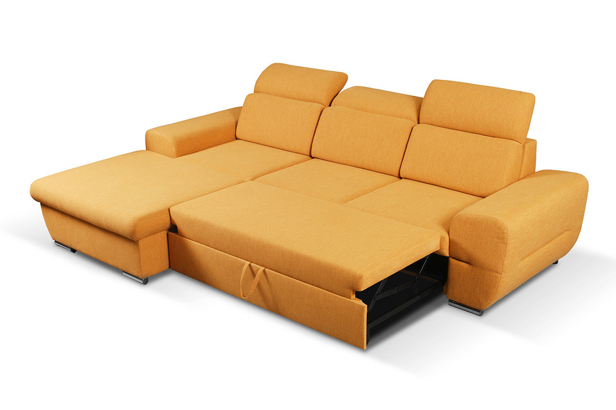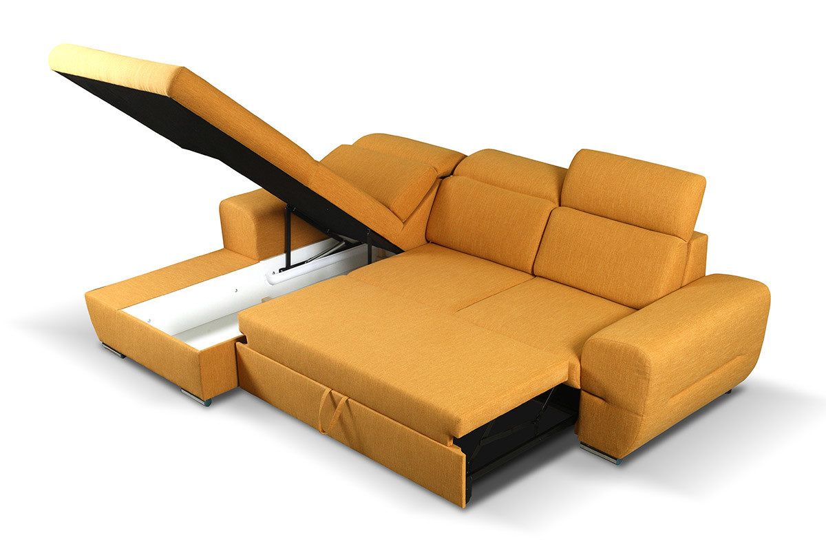 Narożnik EDRES lewy jest nie tylko elegancki i stylowy, lecz praktyczny i wygodny. Posiada funkcję spania i pojemnik na pościel. Niezawodny automat ułatwia jego rozkładanie.Zarówno stelaż, jak i obicie wykonane są z wysokiej jakości materiałów. Tapicerka jest trwała, odporna na ścieranie i zabrudzenia.Dostępny jest tutaj w wersji prawej, w czterech modnych kolorach: żółtym, szarym, granatowym i beżowym.