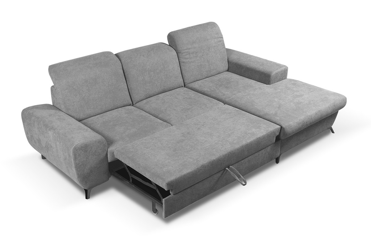 Narożnik lewy i prawy ZAFER to bardzo praktyczny i funkcjonalny mebel, który doskonale nadaje się do salonu nowoczesnego i eleganckiego. Posiada funkcję spania, a także pojemny pojemnik na pościel oraz system rozkładania komfortowego i wygodnego dla każdego. Jest to model, który cechuje się grubym siedziskiem gwarantującym jeszcze większy komfort podczas siedzenia i oglądania ulubionych filmów wraz z rodziną i znajomymi. Narożnik prawy i lewy do salonu posiada obicie z gładkiej tkaniny, co umożliwia ustawienie go nie tylko przy ścianie, ale również w każdym miejscu w pomieszczeniu, gdzie i tak będzie prezentować się pięknie. Całość jest zaprojektowana w taki sposób, by w pełni spełniać wymagania każdego użytkownika. Wygodny narożnik ZAFER dzięki mechanizmowi, który ma ułatwić rozkładanie narożnika, może on w szybki sposób zmienić się w wygodne miejsce do spania nawet dla dwóch osób. . Mechanizm rozkładania DELFIN jest bardzo prosty w obsłudze. Wystarczy pociągnąć za uchwyt i wysunąć wspomagany sprężynami wózek. Można cieszyć się łóżkiem o powierzchni, które ma powierzchnię 130x212 centymetrów. Narożnik z funkcją spania wyposażony został w pojemnik na pościel, który wykonany jest z materiałów najwyższej jakości!