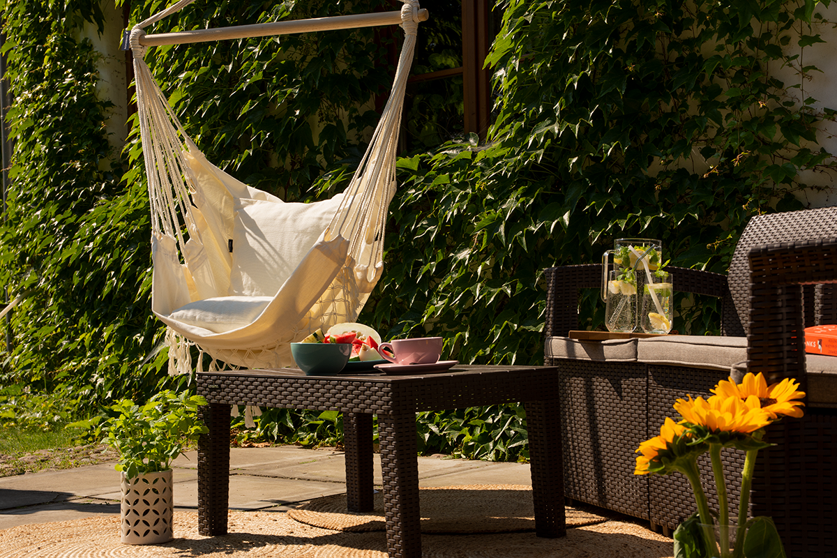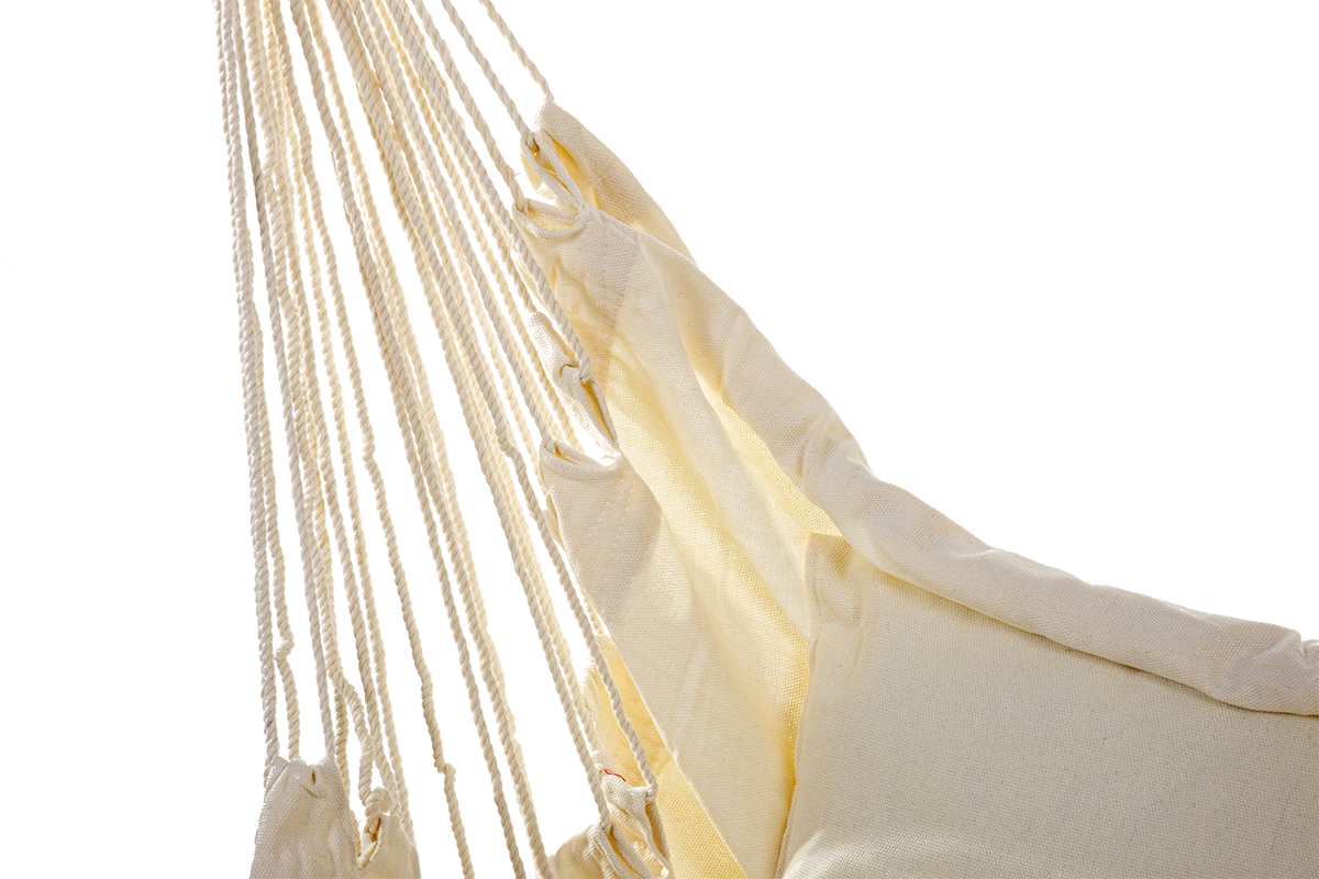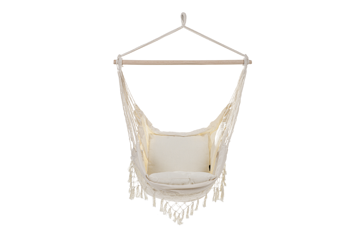 Fotel wykonany jest z plecionej liny bawełnianej z domieszką poliestru, dzięki czemu wygląda naturalnie, a jednocześnie jest bardzo wytrzymały. Co ważne, fotel jest zawieszony na jednym haku, co pozwala na intensywniejsze bujanie się, a jednocześnie jest stabilny dzięki drewnianej belce u góry. Produkt dostępny w dwóch kolorach – beżowym oraz antracytowym.