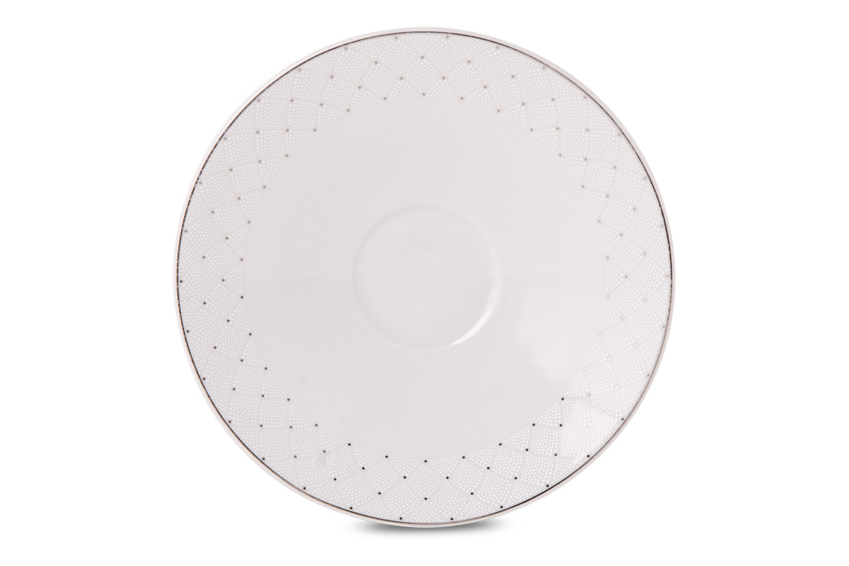 Nieprzeciętna kolekcja naczyń AMELIA CARMEN wyróżnia się zdobieniami w postaci połyskujących i połączonych ze sobą kropek – całość tworzy wyszukany wzór, pełen lekkości i elegancji. Ponadto srebrne wykończenia na brzegach podkreślają piękną biel porcelany. Kolekcję wykonano w całości w polskich fabrykach z najwyższej jakości porcelany, dzięki czemu przez długie lata będzie przyozdabiać stół czy wypełniać urokiem przeszklone witrynki.