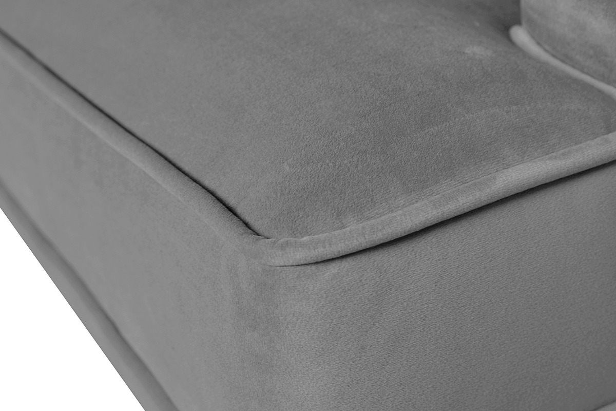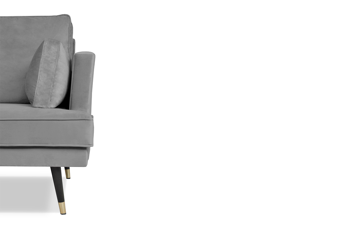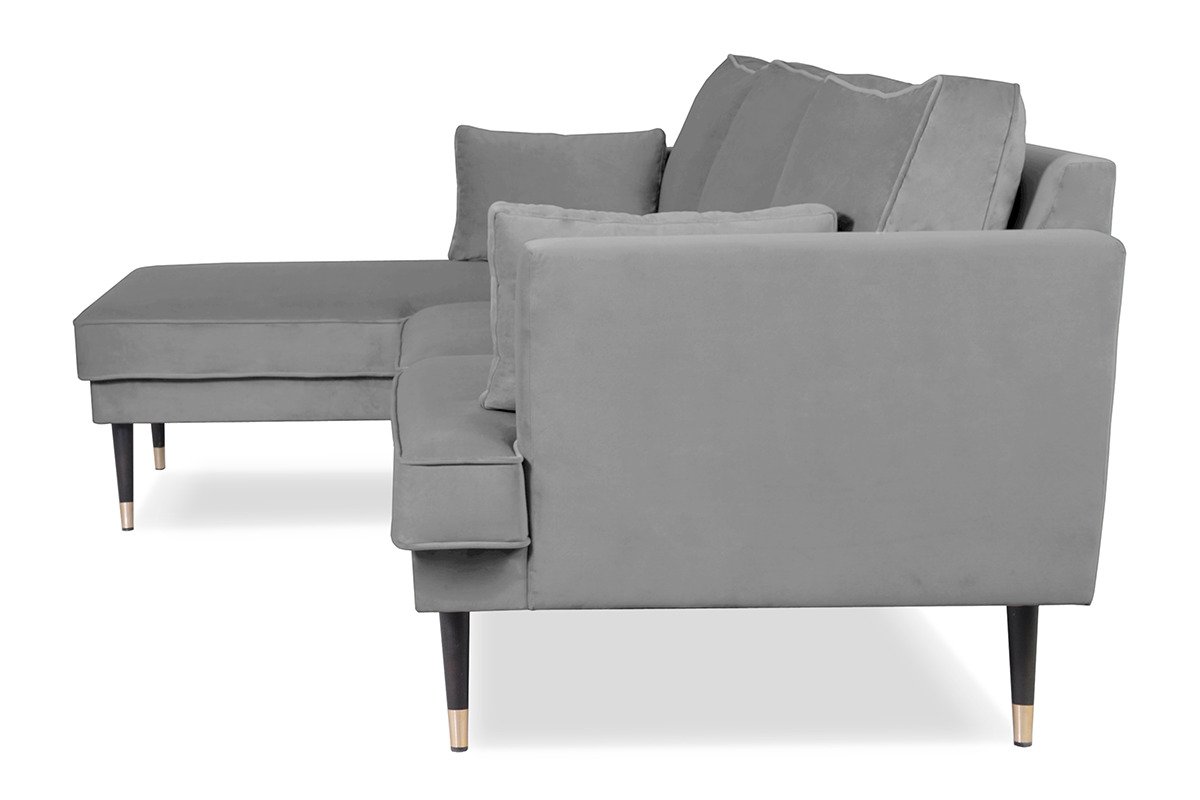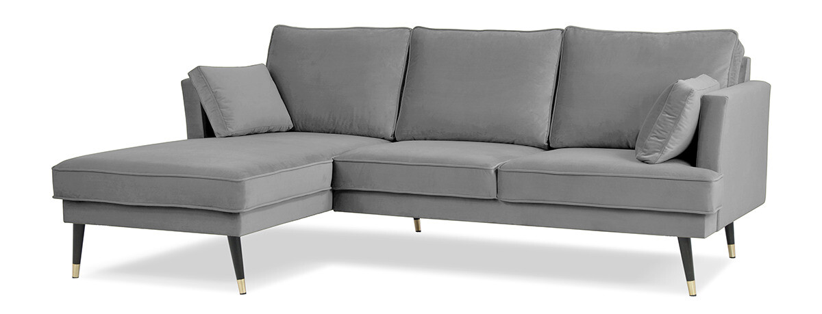 Wyjątkowo elegancki narożnik z szykownego weluru z drewnianymi nogami. Mebel ten łączy w sobie prostą, niewyszukaną formę z szykownym, subtelnie połyskującym materiałem tapicerki i wysokimi nogami z drewna wykończonego stylowym metalowym kielichem. Komfortowy narożnik Falco wykonany jest ze sprężystej i wygodnej pianki, posiada dwie poduszki ozdobne.