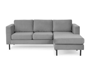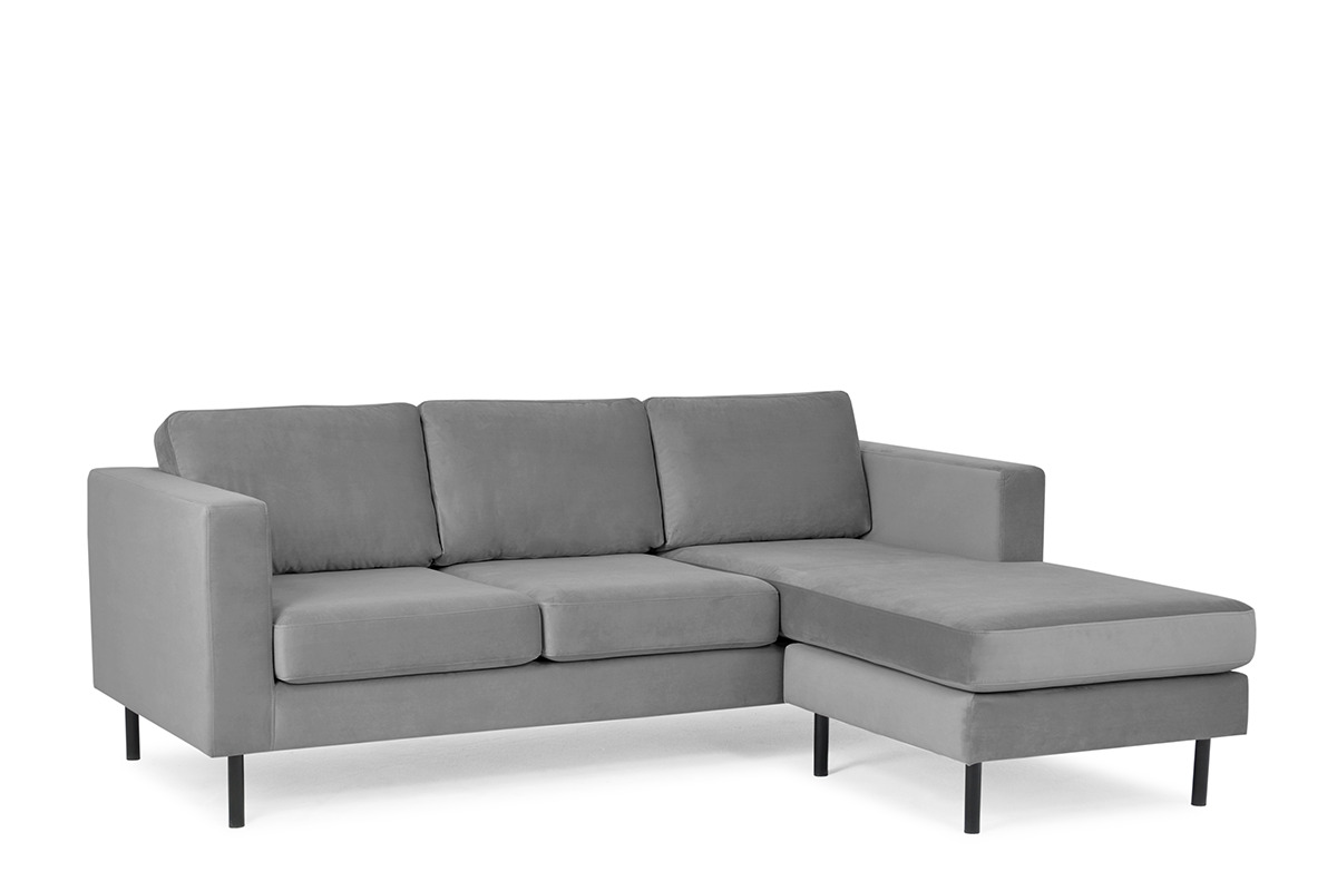 Ten duży narożnik co prawda nie ma funkcji spania, bo rolę otomany odgrywa tutaj luźno dostawiona pufa przykryta wspólnym siedziskiem, ale w niektórych okolicznościach może być wygodnym, pojedynczym łóżkiem. Welurowy narożnik dostępy jest w kolorze granatowym, zielonym, oliwkowym i pudrowym różu, wykończony jest metalowymi nogami.