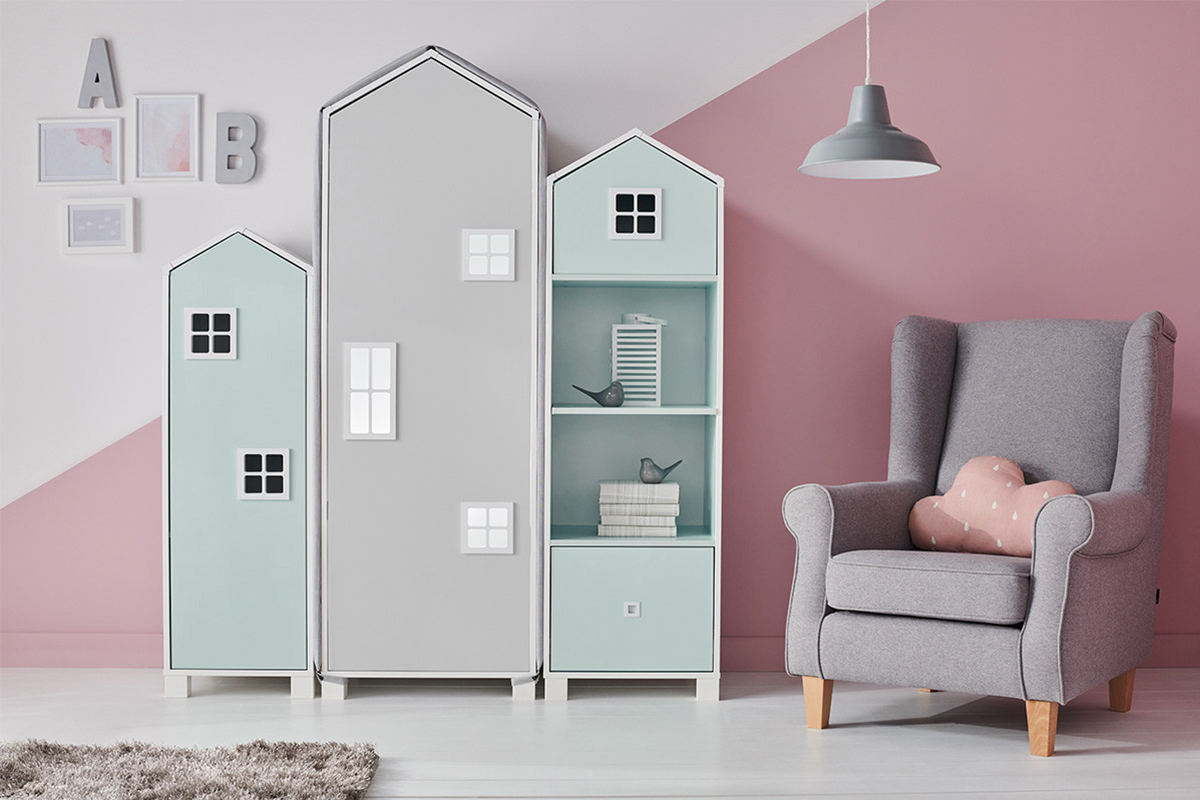 MIRUM zobacz całą kolekcję Zestaw meble domki dla chłopca szare 4 elementy - kolor biały/ciemny miętowy/szary