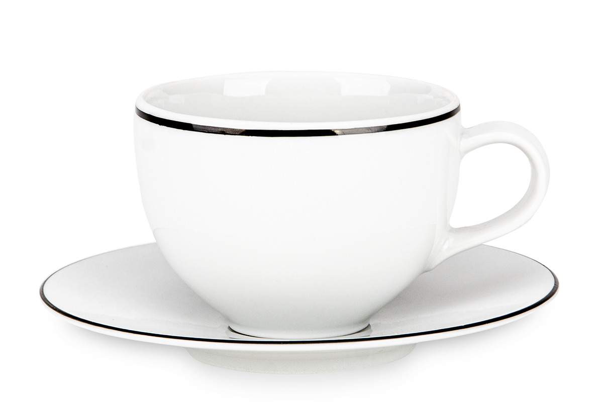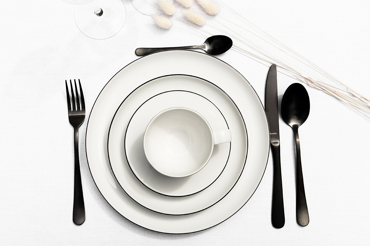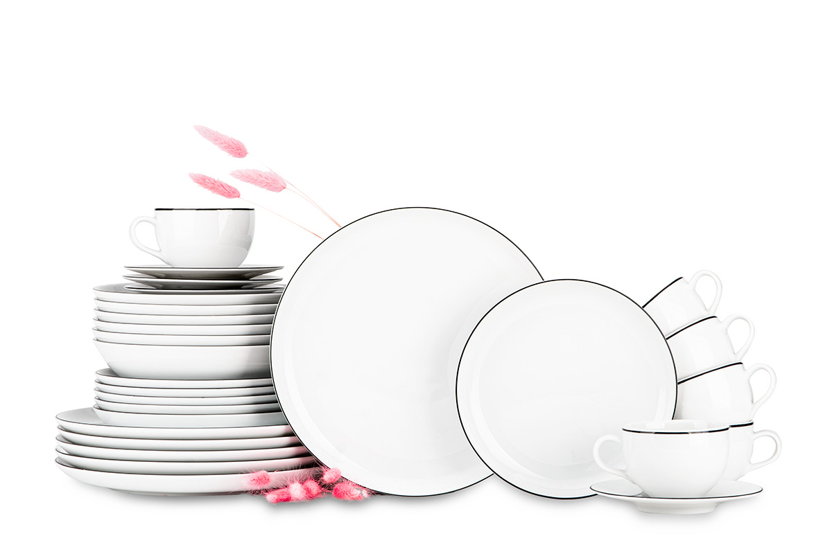 Zestaw zachwyca również eleganckim wykończeniem – podniesione czarne ranty subtelnie odcinają się od pięknej bieli. Ponadto klasyczne kształty i uniwersalne kolory sprawią, że kolekcja sprawdzi się w każdej sytuacji.Serwis nadaje się do mycia w zmywarce oraz do używania w kuchence mikrofalowej.